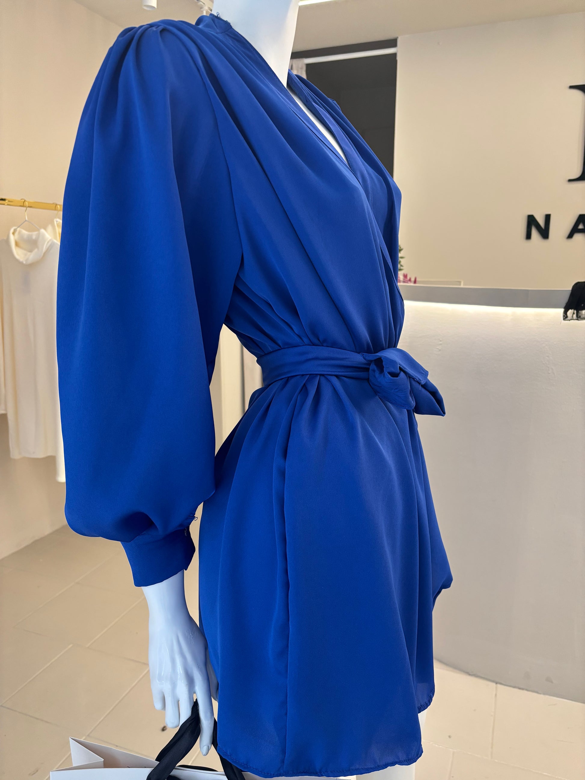 The CHANDELIER DRESS is a statement piece that captures elegance through simplicity and movement. Crafted from fluid satin in a deep royal cobalt blue, it features a wrap-style silhouette that cinches gracefully at the waist with a self-tie belt, creating a flattering hourglass shape. The softly draped bodice and V-neckline evoke effortless sophistication, while the gently puffed shoulders and flowing long sleeves add a touch of vintage romance.