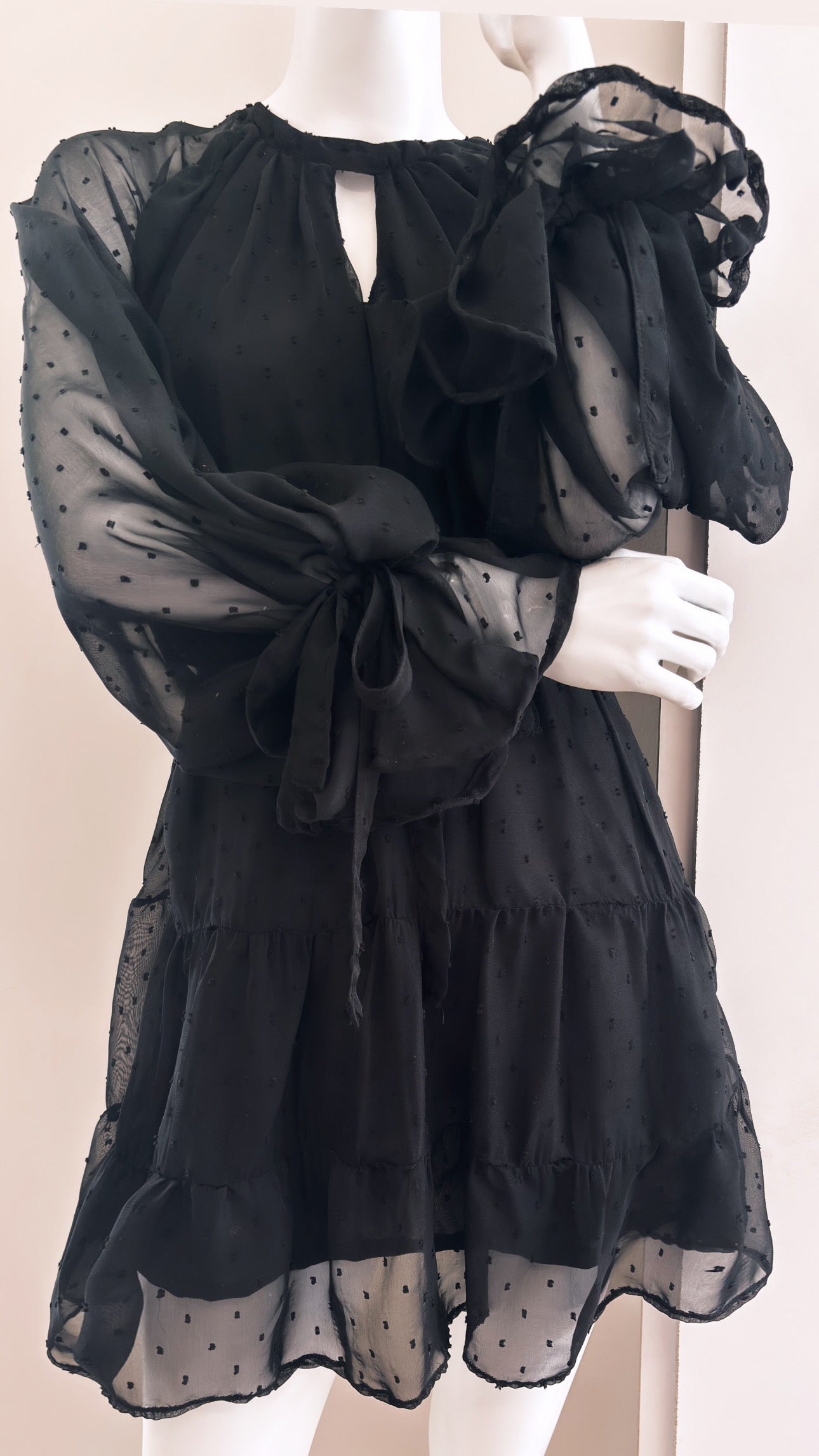 Effortlessly romantic with a touch of mystery, this black chiffon mini dress captures timeless femininity. Crafted from sheer dotted fabric, it features voluminous bishop sleeves with soft ribbon ties and a flowy tiered skirt that moves gracefully with every step. The delicate keyhole neckline adds a subtle allure, making it perfect for both daytime charm and evening sophistication.